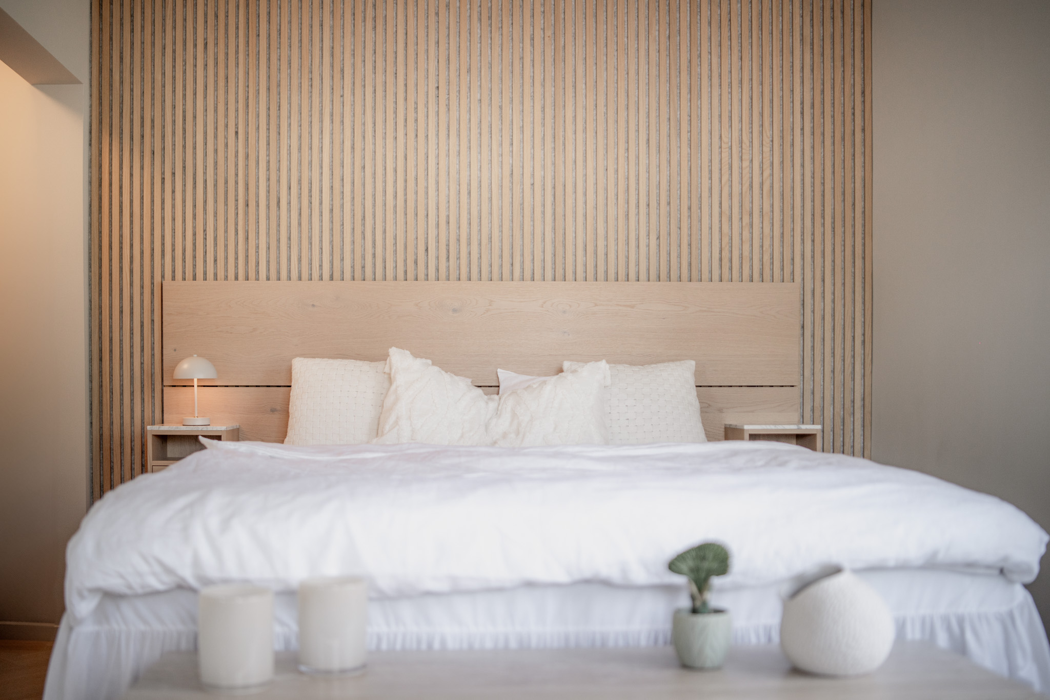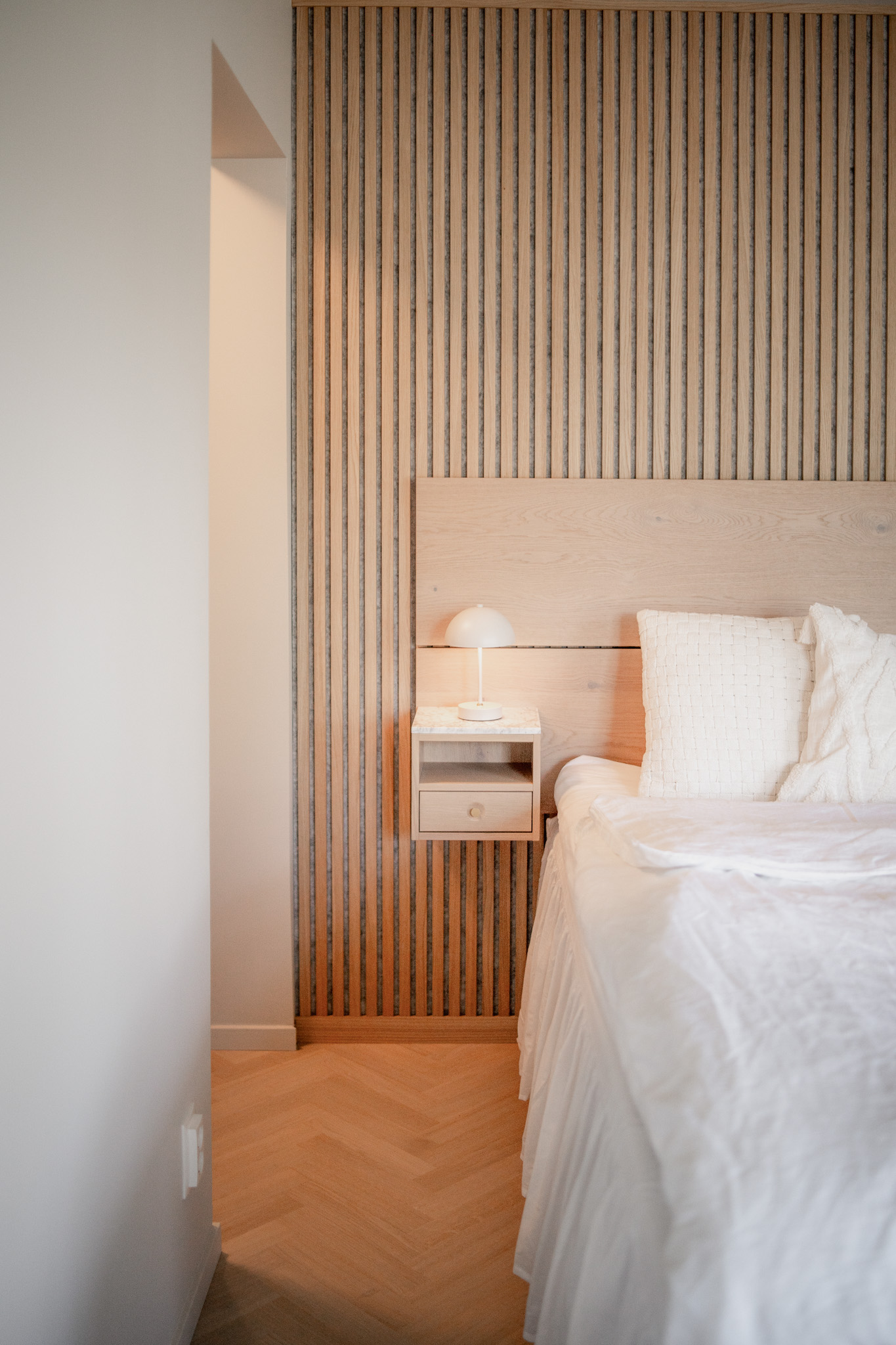 Ved at tilføje en rolig farvepalet, nøje udvalgte detaljer og træpaneler har de forvandlet soveværelset til et varmt og indbydende rum.