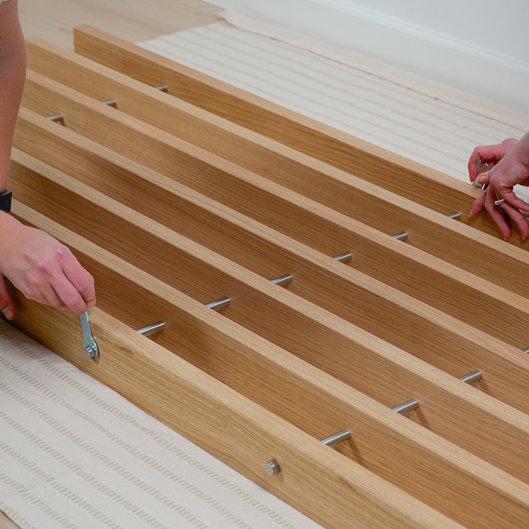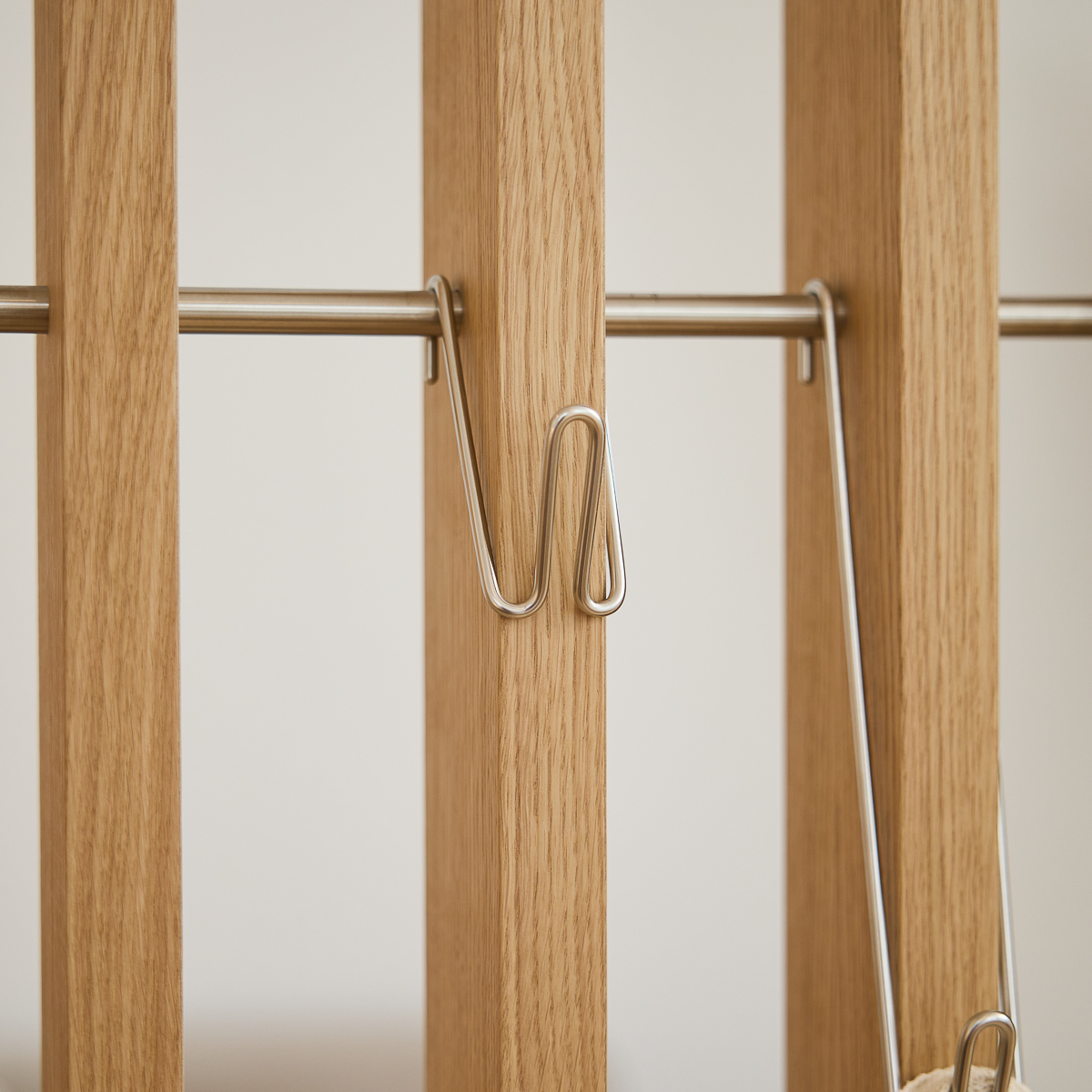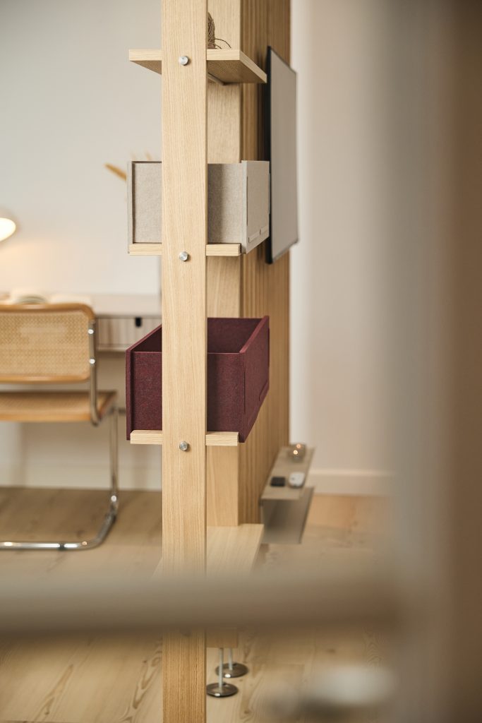 Embrace er bygget af egetræsfiner og rustfrit stål og består af modulære elementer, der kan arrangeres og justeres over tid. Det er designet til at opdele rum, mens det holder dem åbne og brugbare.