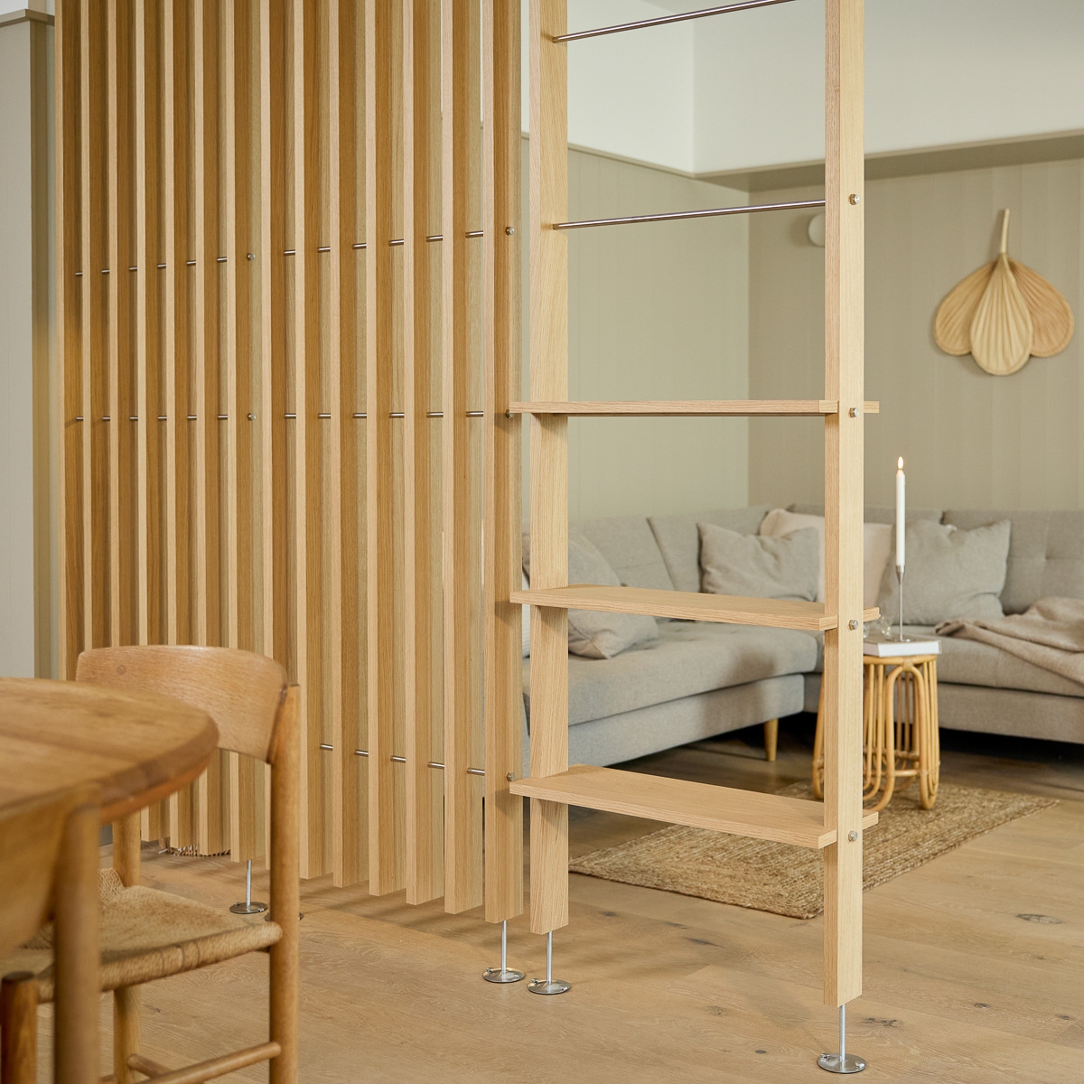 Embrace er et gulv-til-loft rumdeler-system. Det lader dig opdele åbne rum uden at bygge vægge eller blokere lys. Systemet installeres mellem gulv og loft og skaber klare zoner i dit hjem.
