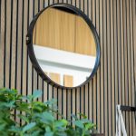 WoodUpp Spejlet er lavet af Ø60 cm kvalitetsglas med en slidstærk ramme i krydsfinér – fås i natur eg eller sort finér. Den samlede bredde, inklusive fingerskruerne i siden, er 62,8 cm.