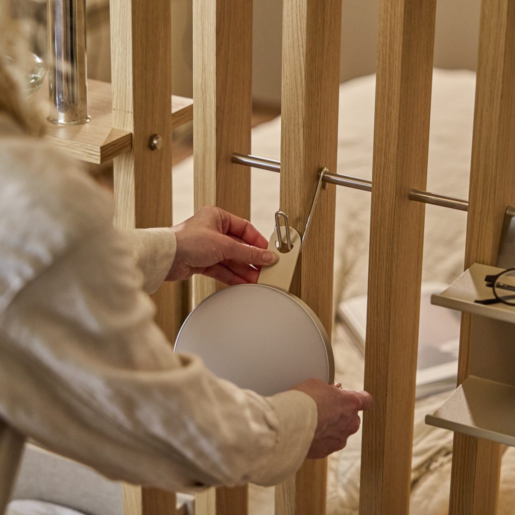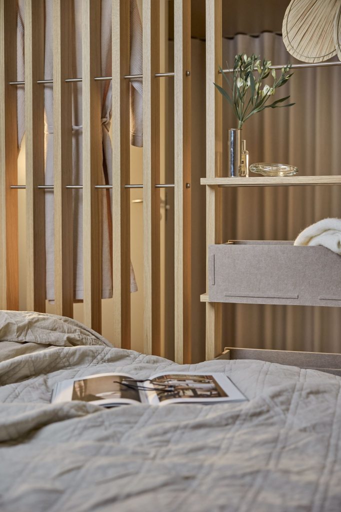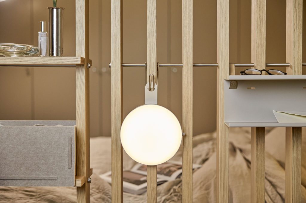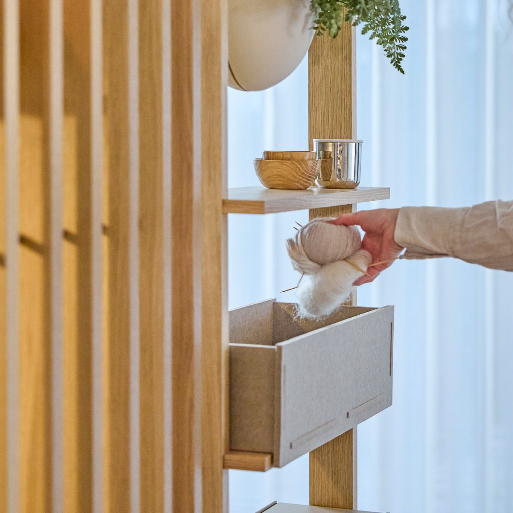 Embrace | BM1 er en af de to kerne moduler i Embrace-systemet. Fremstillet af egetræsfiner og rustfrit stål, monteres BM1 mellem gulv og loft og hjælper med at skabe klare zoner med struktur og formål.