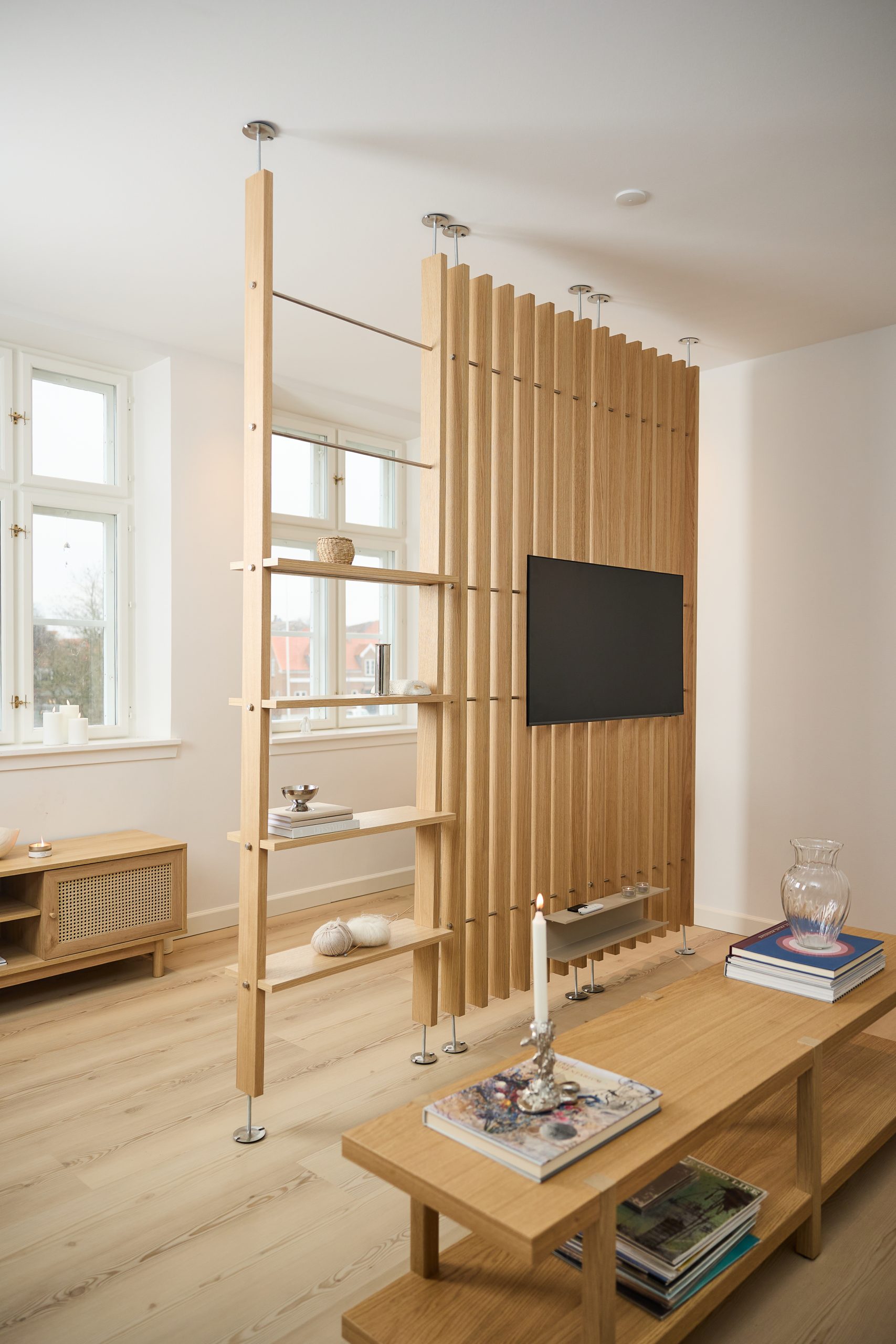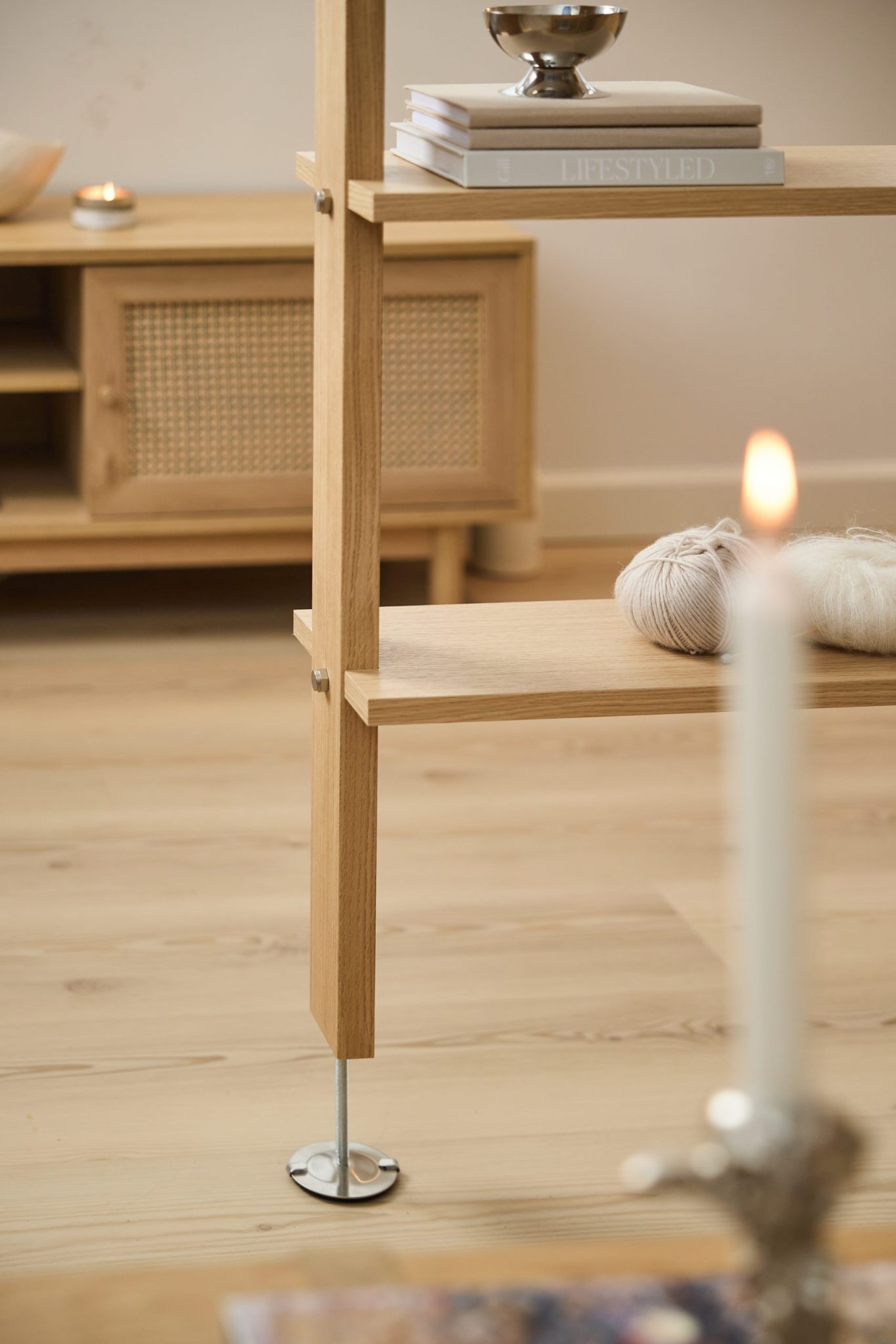 Brug hylden til dekoration, planter eller de ting, du ønsker at have inden for rækkevidde. Egetrædesignet tilføjer varme og holder Embrace rumdeleren let og rolig.