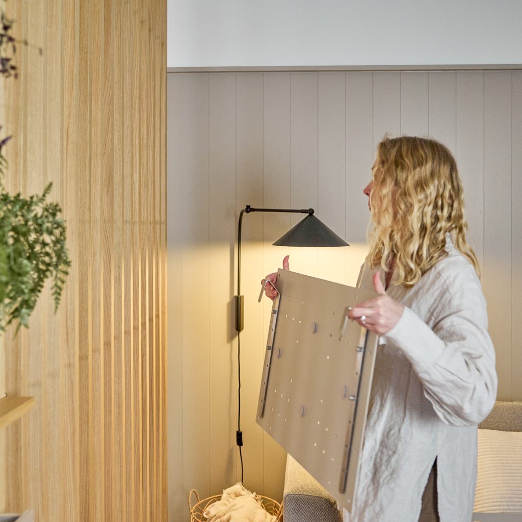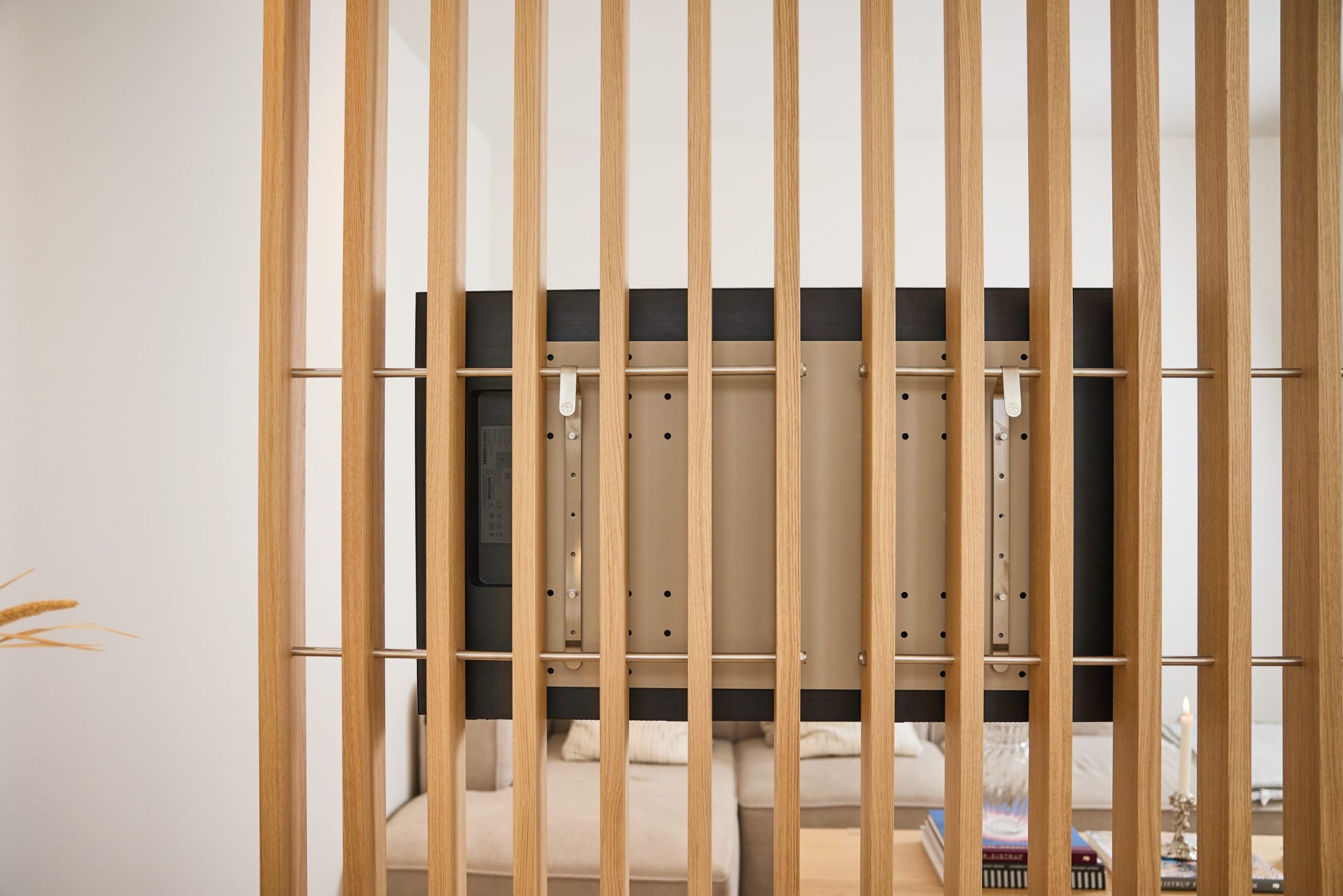 Nell TV-Mount lader dig placere dit TV direkte inde i Embrace | BM1. Det er højdejusterbart og lavet af stærk stål, så du kan placere din skærm præcist, hvor den fungerer bedst i rummet. Der er ingen boring i væggen og ingen fast opsætning. TV’et bliver en del af Embrace-systemet, så du kan ændre højden eller layoutet, når dine behov ændrer sig.